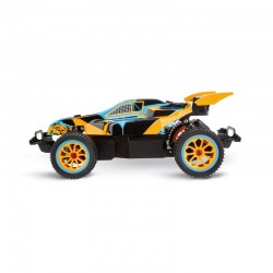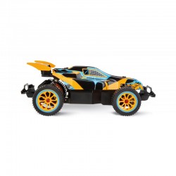 Ice Kobold jest zdalnie sterowanym samochodem wyścigowym w drapieżnych pomarańczowych i niebieskich barwach. Ten szybki, osiągający prędkość do 25 km/h buggy, to żywy duch offroadu! Podczas jazdy wyścigówka jest chroniona niezwykle elastyczną, odporną na zachlapania karoserią, dzięki czemu nadaje się na niemal każde warunki drogowe. Używaj auta Carrera RC wewnątrz i na zewnątrz. Podwozie wyposażone w resory i opony pneumatyczne czynią z Ice Kobold prawdziwego mistrza outdooru.
