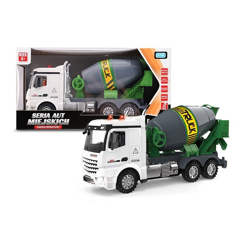 Betoniarka z realistycznymi efektami dźwiękowymi oraz świetlnymi. Dodatkowo ma ruchome elementy oraz napęd frykcyjny. Ma długość 30 cm. Wymaga 2 baterii AA 1,5V (nie dołączono do zestawu). Niezawodny podczas zabawy w miasto. Funkcje: - napęd frykcja, - otwierane drzwi, - dźwięk pracy silnika, - światła z przodu i z tyłu, - światła syren alarmowych, - obracana betoniarka. Wymiary opakowania: 37x19,5x12cm