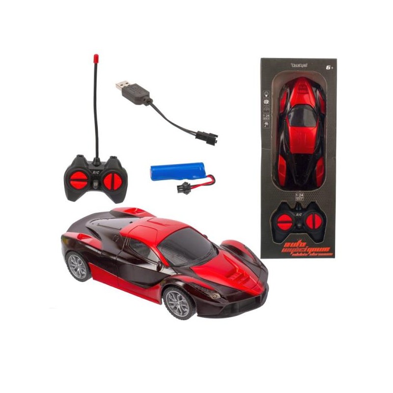 Auto sportowe posiada efekty świetlne i dźwiękowe, posiada gumowe koła z wyraźnie zaznaczonym bieżnikiem. Pojazd wykonany z plastiku w skali 1:24. Zabawka sterowana pilotem, porusza się w lewo, prawo, tył, przód.