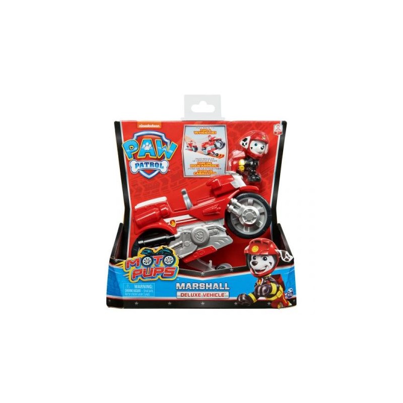 Pojazd Moto Pups Deluxe! Unikalne motocykle każdego szczeniaka mają autentyczną grafikę i detale, duże koła i funkcję cofania, która pozwala jeździć na jednym kole! Przejedź się na jednym kole z luksusowym pojazdem swojego pupila!