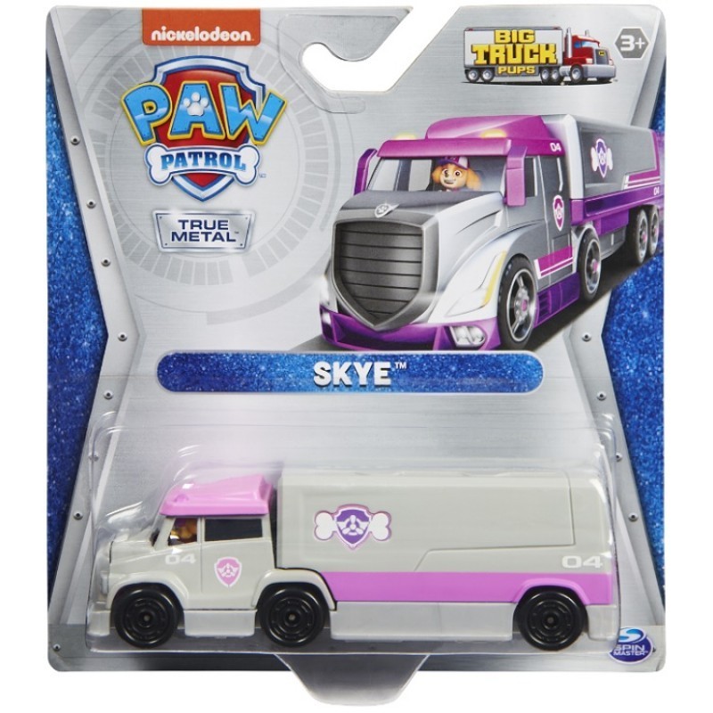Świetny komplet z serii Big Truck Pups z zupełnie nowymi, metalowymi pojazdami. W komplecie znajdziecie ciężarówkę Skye wraz z jego mini figurką za kierownicą, która jest przytwierdzona na stałe. Ciężarówka przedstawiona jest w charakterystycznych dla bohaterki szarych barwach z różowymi elementami. Pojazd w całości został wykonany z metalu.