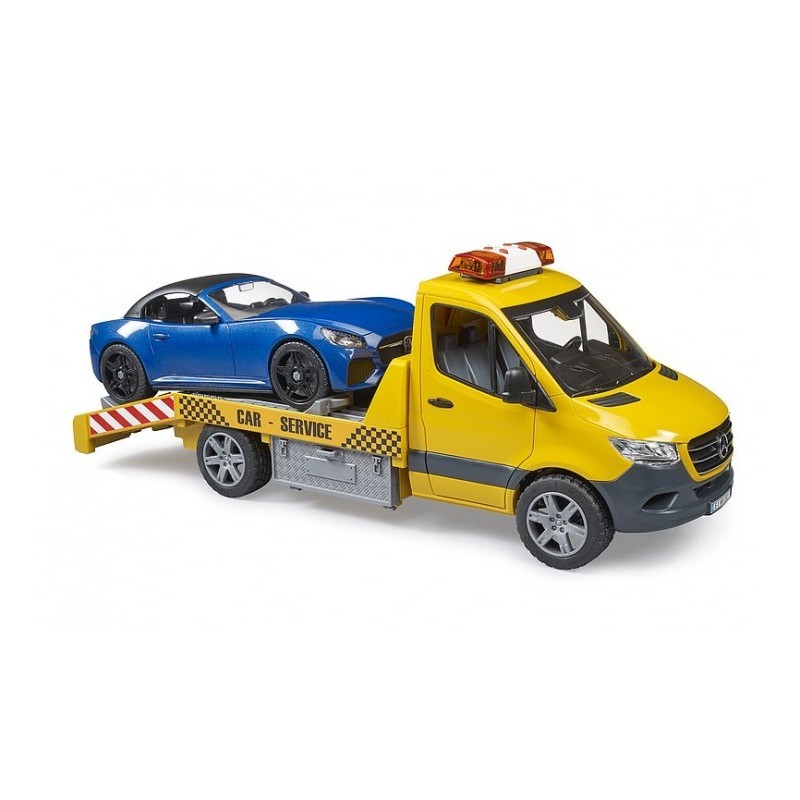 Nowoczesny design auto transportera robi wrażenie już przy pierwszym spotkaniu. Nowy model wyróżnia nowa kabina z innymi światłami, zupełnie inne koła i moduł dźwiękowy. Pojazd transportowany na lawecie również się zmienił i jest nim niebieski Roadster. Pomoc drogowa MB Sprinter z Raodsterem sprawi, że przewieziesz każdy niesprawny pojazd jak też odholujesz ten po wypadku. Laweta MB Sprinter dominuje na polskich drogach, dlatego też został dodany do gamy pojazdów marki Bruder.