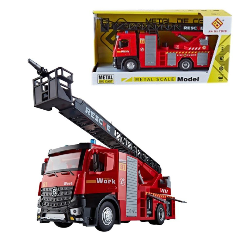 Dodatkowe funkcje, takie jak ruchome ramie wysięgnika zakończone psikawką do wody, otwierane drzwi i ruchome lusterka, sprawiają, że zabawa staje się jeszcze bardziej realistyczna. Po otwarciu bocznej rolety nasz maluch znajdzie idealne miejsce do przechowywania sprzętu strażackiego.
