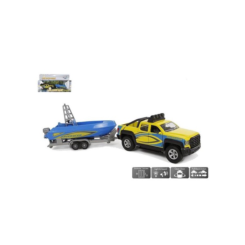 Auto z łodzią i napędem. Samochód ma również otwierane drzwi . Zabawka działa po założeniu baterii 3 x LR 41 - 1,5 V (załączone do zestawu)