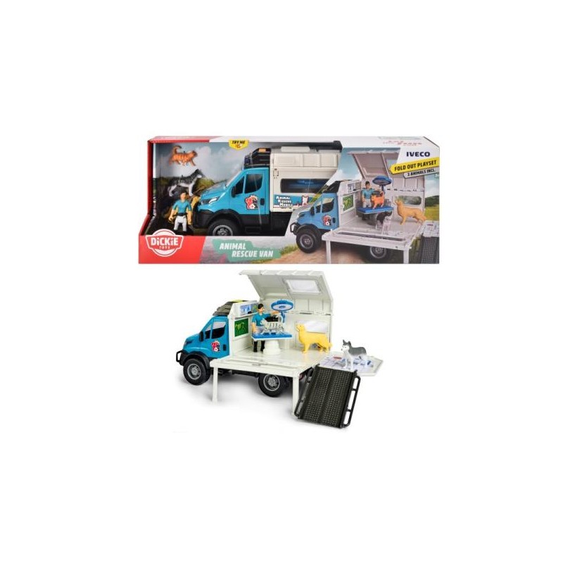Duży Van z wyposażeniem do ratowania zwierząt. Zestaw wykonany z bardzo dobrej jakości materiałów w ciekawej kolorystyce. Auto posiada efekty świetlne i dźwiękowe, otwierane drzwi i ruchome elementy.