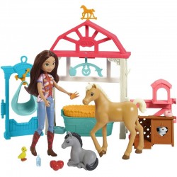 Przedszkole dla źrebaczka to wspaniałe miejsce, w którym maluch pozostanie otoczony troską i odpowiednią opieką. Zestaw z serii Mustang Spirit zawiera wszystko, co najpotrzebniejsze do prowadzenia opieki nad maluchem – specjalny kojec, chusta do bujania i ważenia czy mały boks do pielęgnacji umożliwią Lucky zajmowanie się rozbrykanym źrebaczkiem. Opakowanie zawiera ponad 10 elementów, wśród których znajdują się dwie figurki koników oraz figurka uroczej Lucky . Dziewczynka wiernie oddaje wygląd bajkowej bohaterki i ma na sobie dżinsowe spodnie, kowbojki i kolorową koszulkę. Jesteś gotów, by wcielić się w jej rolę i przejąć opiekę w przedszkolu dla źrebaczka?