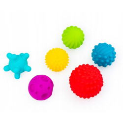 Super piłki sensoryczne dla niemowlaka do masażu zabawy. Zestaw składa się z sześciu miękkich piłeczek, z których każda wyróżnia się unikalnym kształtem, kolorem oraz różnorodnymi wypustkami. Dzięki nieregularnej powierzchni i odpowiedniemu rozmiarowi, idealnie dopasowanemu do małych rączek, piłeczki są łatwe do chwytania przez maluszka.