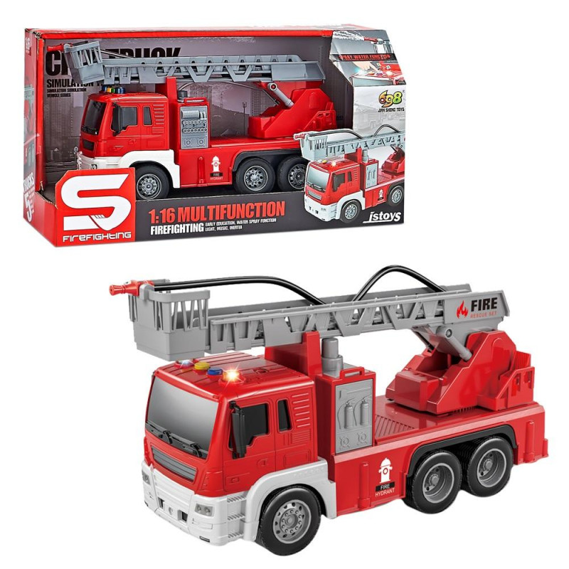 Straż pożarna z drabiną, pryskająca wodą. Drabina okręca się o 360 stopni. Samochód posiada efekty dźwiękowe i świetlne.