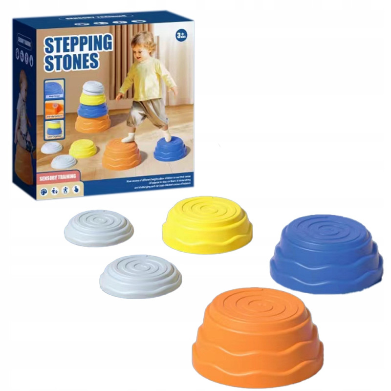 Zestaw składa się z pięciu elementów o różnych kolorach, różnej wielkości i wysokości. Zadaniem dziecka jest przechodzenie z jednego kamienia na drugi zachowując balans i starając się nie spaść na podłogę. Zabawka wykonana jest z bardzo wytrzymałego plastiku.