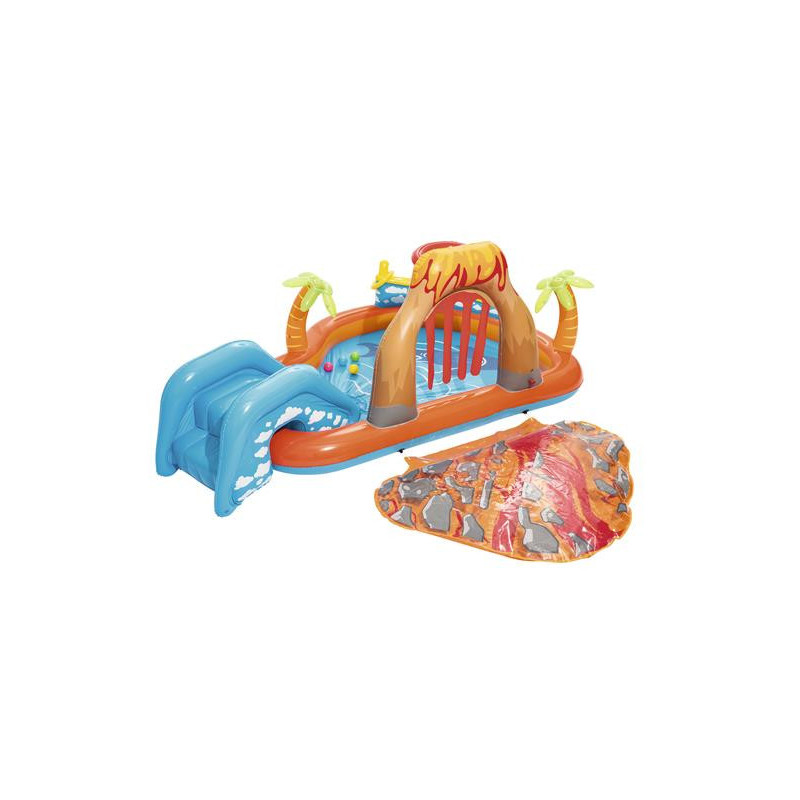 Dmuchany Plac zabaw firmy Bestway.Dmuchany plac zabaw z miękką podłogą i zjeżdżalnią, którą można odłączyć. Plac zabaw wyposażony jest w wiele niespodzianek, które będą stymulować rozwój Twojego dziecka. Dodatkowo do zestawu dołączono dmuchaną rampę, 4 piłeczki, pierścień do zabawy w rzut kółkiem, wyjmowaną zjeżdżalnię dmuchaną zabawkę wodną .Zestaw zawiera łatkę naprawczą. Maksymalne obciążenie 85 kgWymiary 265 x 265 x 104 cm