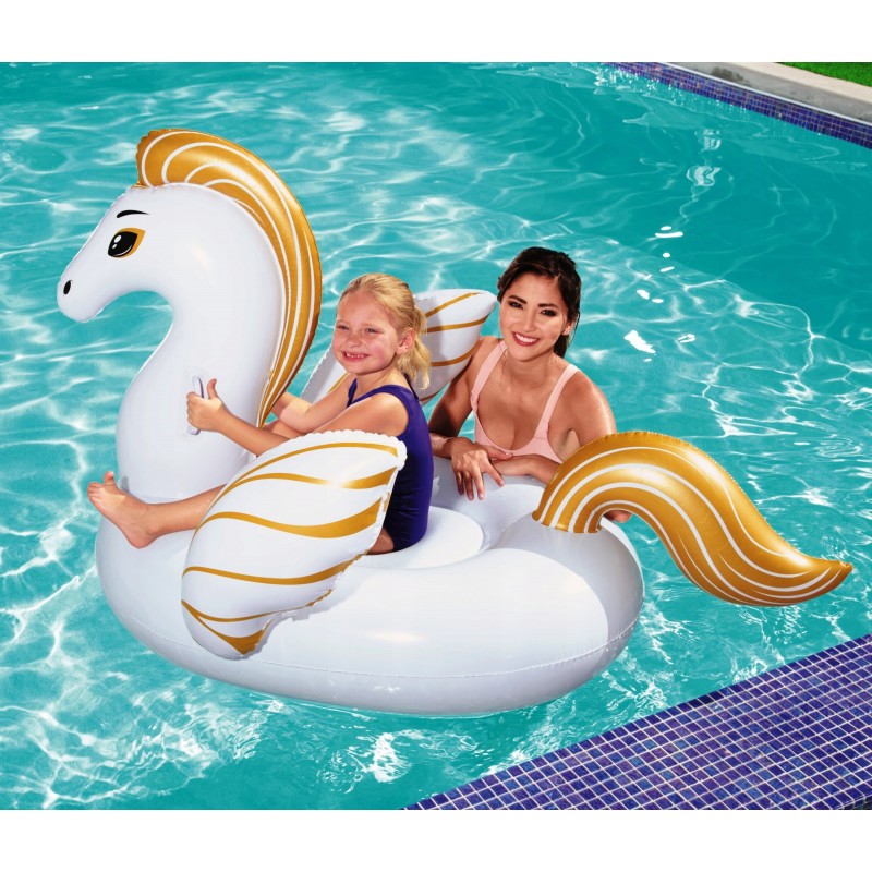 Pegaz dmuchamy firmy Bestway. Pływający pegaz z dwoma wytrzymałymi uchwytami. W zestawie z łatką naprawczą.Wymiary: 159 x 109 cm Max obciążenie 45 kg