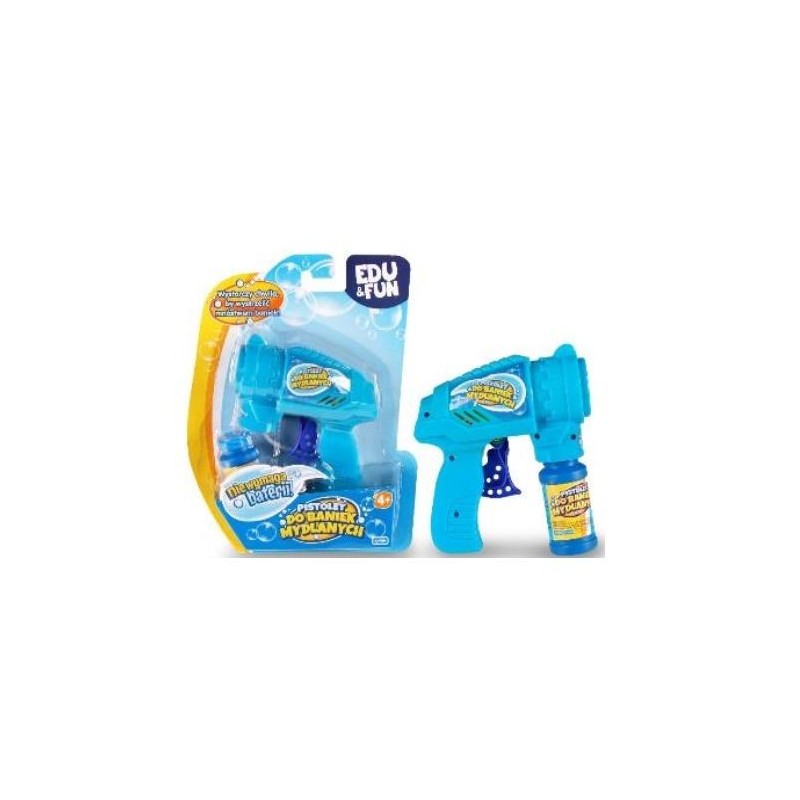 Niebieski pistolet do baniem mydlanych. W zestawie: pistolet, płyn do robienia baniek. Nie wymaga baterii,