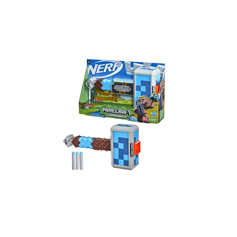 Nerf i Minecraft łączą siły, by tworzyć charakterystyczne wyrzutnie zmieniające sposób walki. Młot Nerf Minecraft Stormlander czerpie inspirację z gry Minecraft: Dungeons, wykorzystując wygląd młota znanego z popularnej gry wideo. Ten strzelający strzałkami młot mieści 3 strzałki Nerf Elite i wystrzeliwuje je po 1.