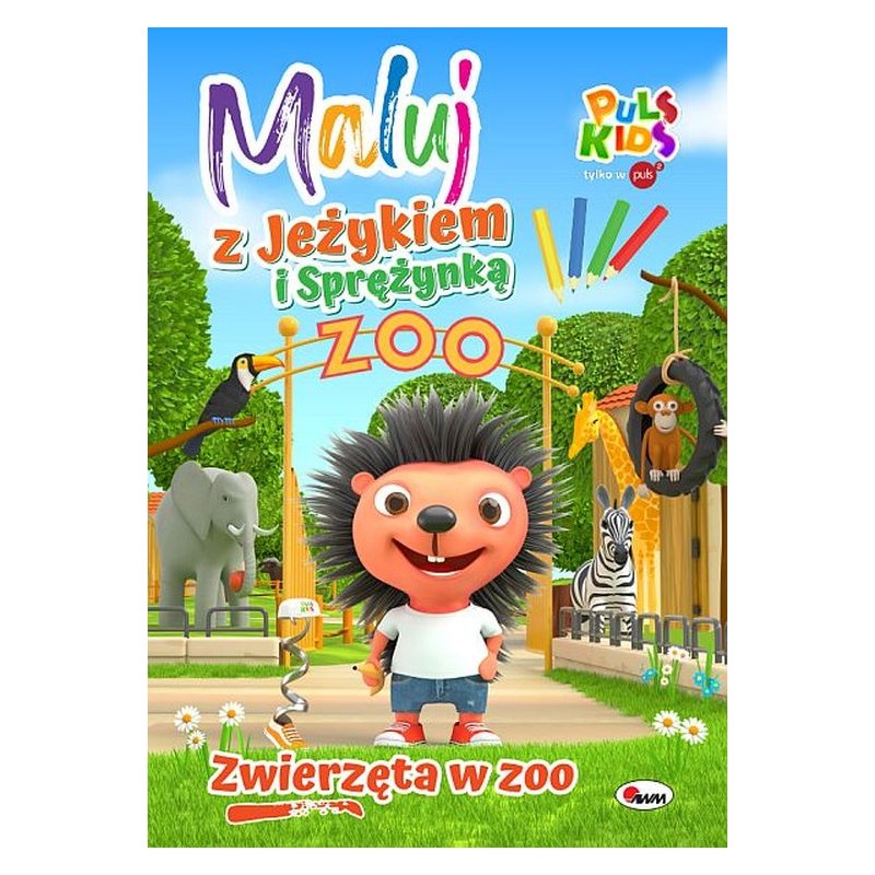 Kolorowanka z postaciami ZNANYCH i LUBIANYCH BOHATERÓW pasma PULS KIDS emitowanego na kanale PULS 2. Scenki pokazują JEŻYKA i SPRĘŻYNKĘ w ZOO.