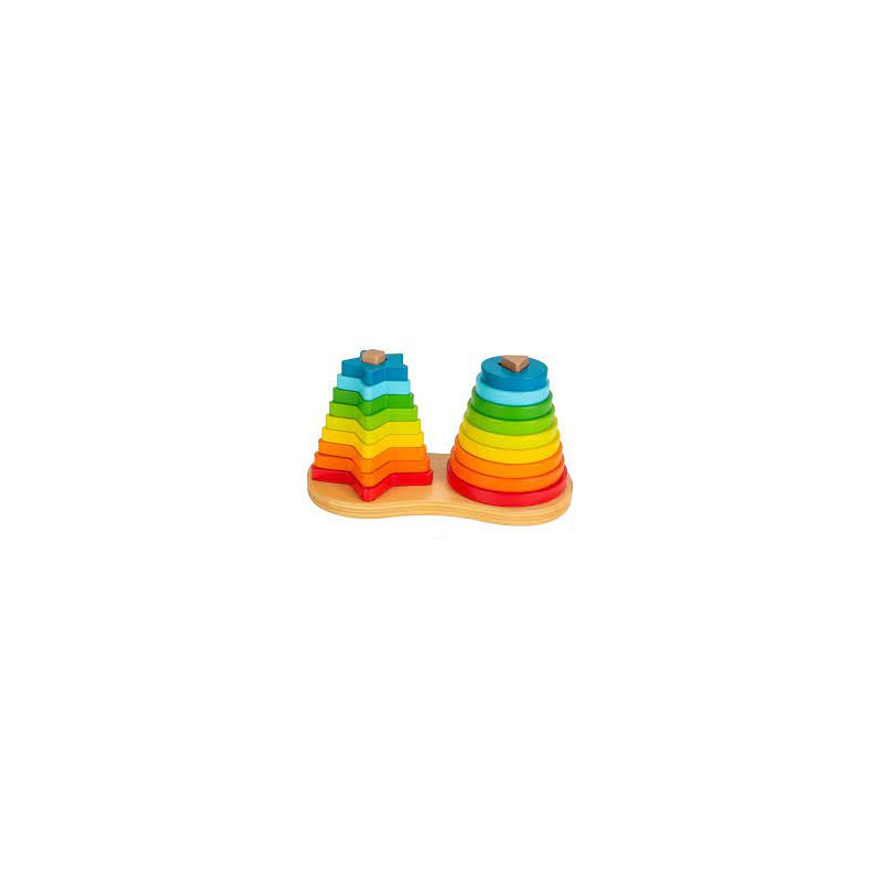 Zestaw składa się z 19 elementów. Kształty można nakładać na przeznaczone do tego stosy. Celem jest nałożenie na stosy kształtów od największego do najmniejszego układając je jeden na drugim. Układanie w stosy i sortowanie to zabawny sposób na naukę dzieci kształtów i rozmiarów.