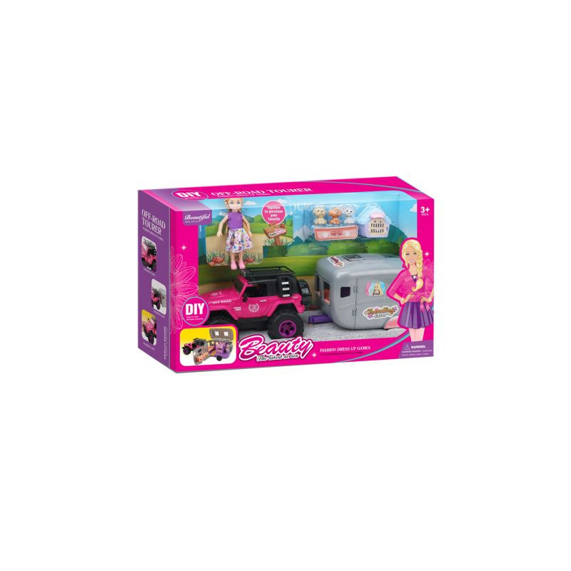 Jeep na baterie, ze światłem i dźwiękiem. Doczepiona przyczepa z akcesoriami. W zestawie również lalka z trzema pieskami i domkiem dla nich. Jeep wymaga baterii - 3xAG13 (dołączone). Wymiary opakowania: 49.5 x 14.5 x 28.5 cm