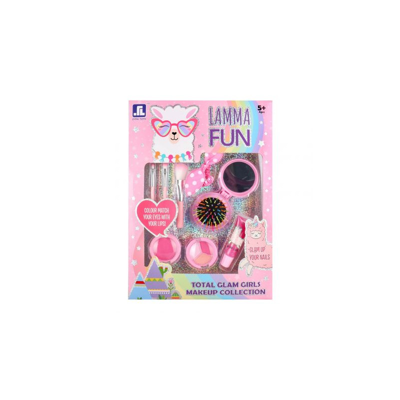 Zestaw składa się z cieni, błyszczyka, pudru, pędzelków do malowania, składanej szczotki z lusterkiem oraz gumki do włosów. Wymiary opakowania: 33 x 4 x 23.5 cm