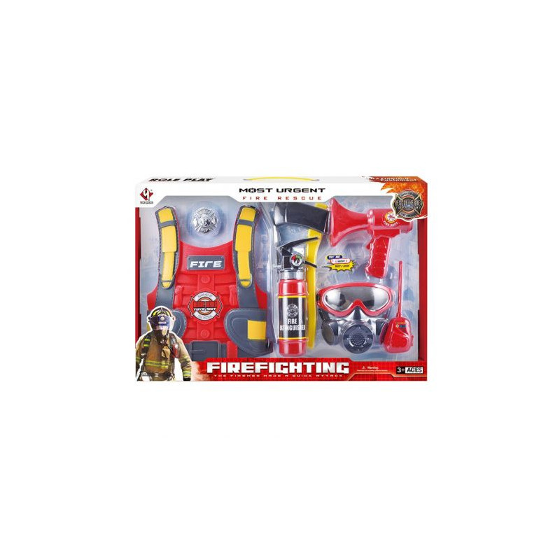 W zestawie znajduje się między innymi kamizelka ochronna, gaśnica, okulary ochronne, toporek, megafon.