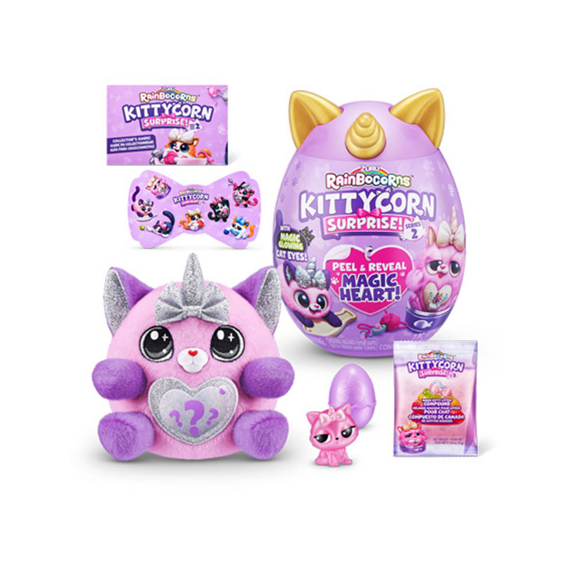 Mała pluszowa maskotka niespodzianka kotek ukryta w jajku. W środku 3 niespodzianki m. in. naklejki. Jajko i kotek mają miekki ogonek kulka.
