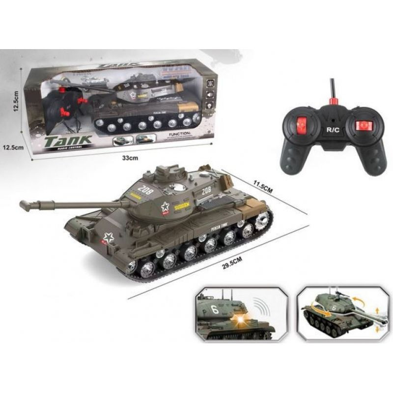 Czołg R/C, rozmiar: 29,5x11,5cm. Funkcje: sterowanie do przodu, do tyłu, w lewo, w prawo, światło, dźwięk, ruchoma wieżyczka