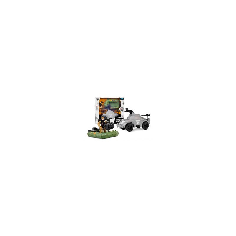 W zestawie: łódź wojskowa, wóz wojskowy, figurka żołnierza, funkcje: ruchome elementy,