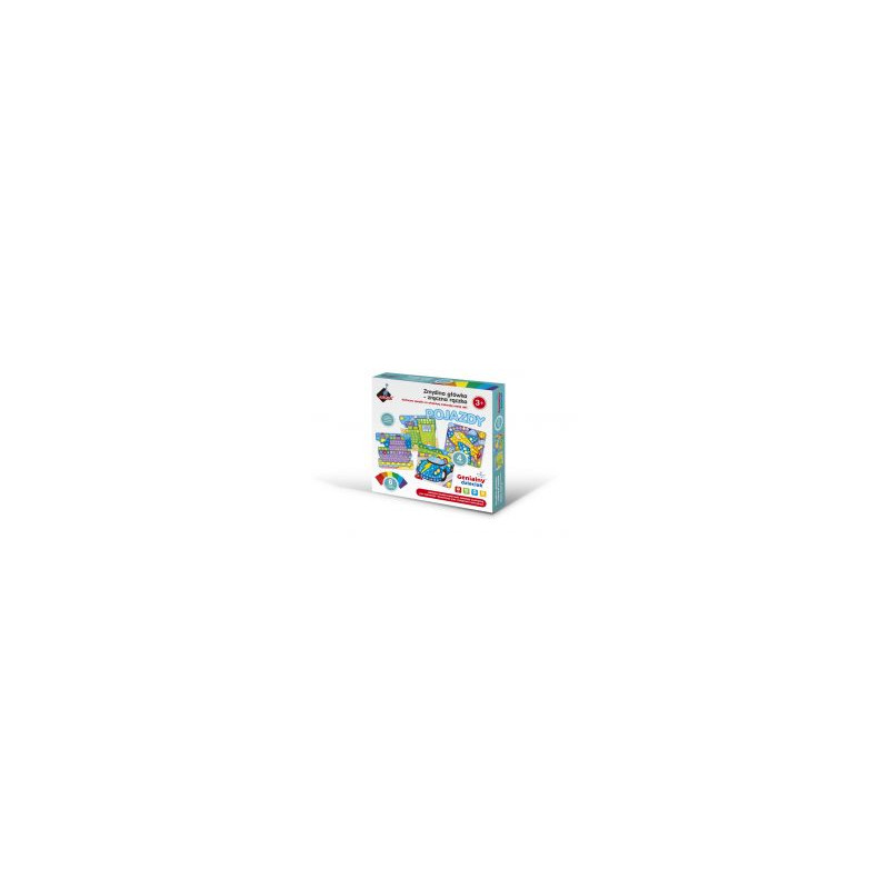 W zestawie są 4 obrazki, na które w odpowiednie miejsca należy nakleić piankowe elementy w kształcie kółka, kwadratu czy trójkąta.