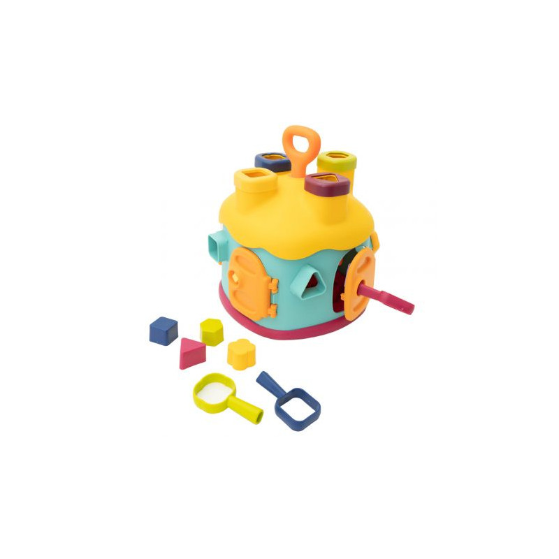 Zabawka posiada 4 kluczyki - odpowiednie do 4 drzwiczek, sorter na dachu, 8 klocków w różnych kształtach.