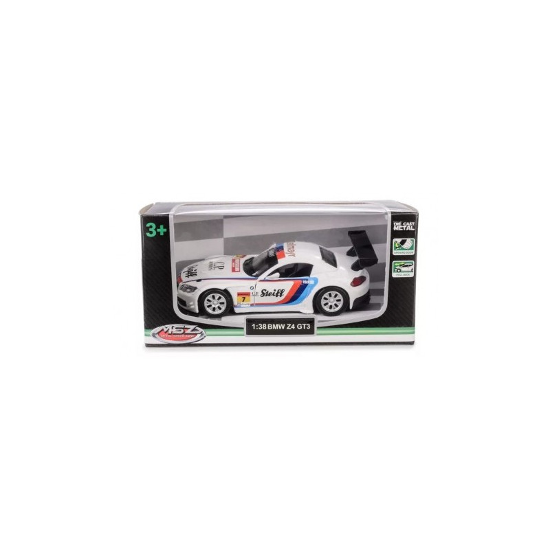 MSZ 1:38 BMW Z4 GT3/biały Model wykonany z metalu i plastiku. Posiada otwierane boczne drzwi, przez które można zajrzeć do wnętrza modelu oraz posiada gumowe opony. Model z napędem typu pull-back.