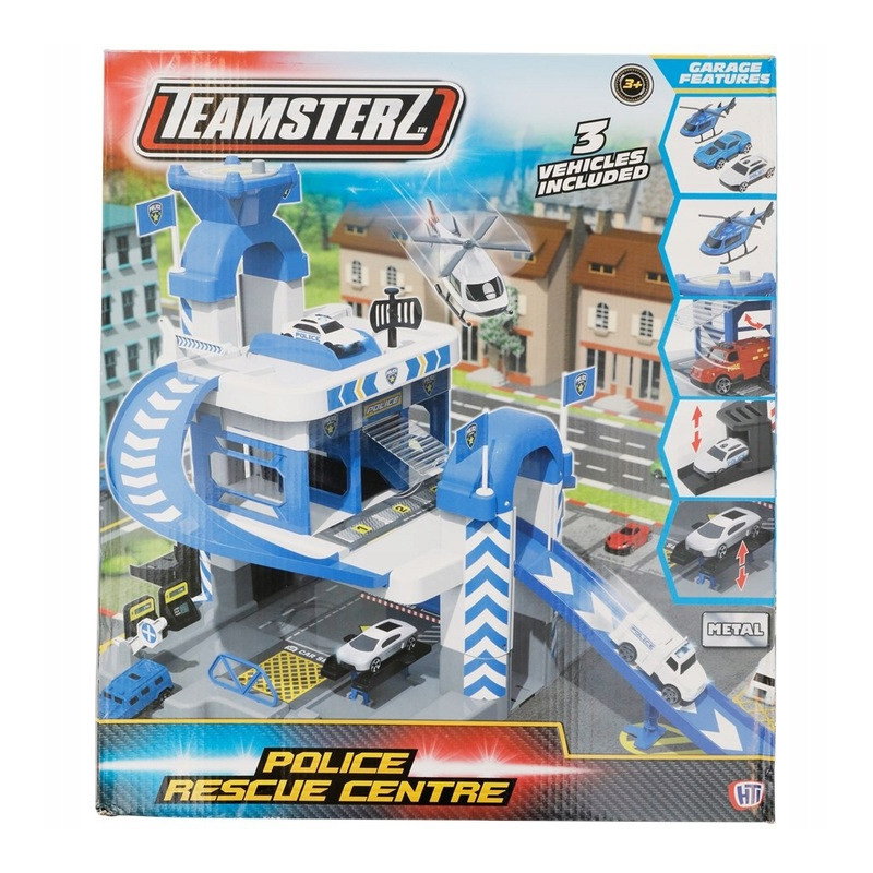 3-poziomowy zestaw do zabawy w garażu. Zawiera rampy łączące bariery między poziomami, dystrybutory benzyny, rampę inspekcyjną, windę roboczą i więzienie. Garaż wyposażony jest w 3 ręcznie obsługiwane drzwi z żaluzjami.