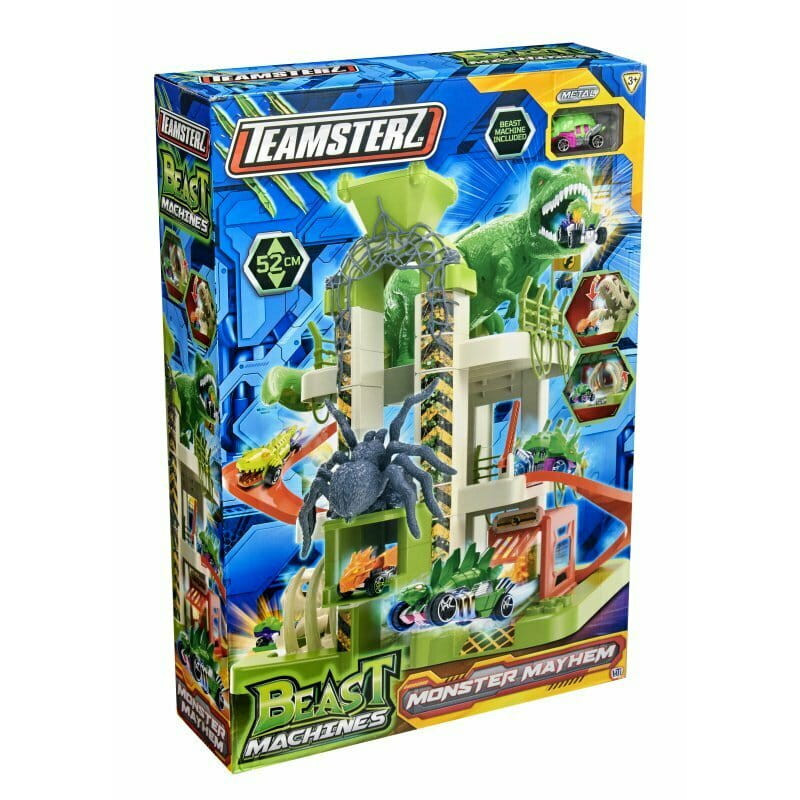 Zabawa pojazdami wchodzi na wyższy poziom dzięki 3-poziomowemu garażowi Teamsterz Beast Machines Monster Mayhem. W zestawie znajdziemy między innymi zakręcony tor wyścigowy, jeden samochodzik Beast Machine, działającą windę, wielką czarną tarantulę i ogromnego, groźnego dinozaura znajdującego się na najwyższym poziomie garażu. Autko będące częścią zestawu odznacza się lśniącymi, srebrnymi felgami oraz ruchomymi kółkami, które umożliwiają poruszanie się. Wjedź windą na sam szczyt garażu, aby zjechać po zakręconym torze wyścigowym, lecz uważaj na tarantulę. Uciekaj przed dinozaurem i pędź po torze wyścigowym. Przygoda trwa dalej na poziomie bazowym, gdzie znajduje się czaszka dinozaura i wyrzutnia samochodów wykonana z kości tych prehistorycznych gadów. Wszystkie elementy zestawu zostały wykonane z dbałością o najmniejsze szczegóły, co sprawia, że są niezwykle atrakcyjne i wyjątkowe.