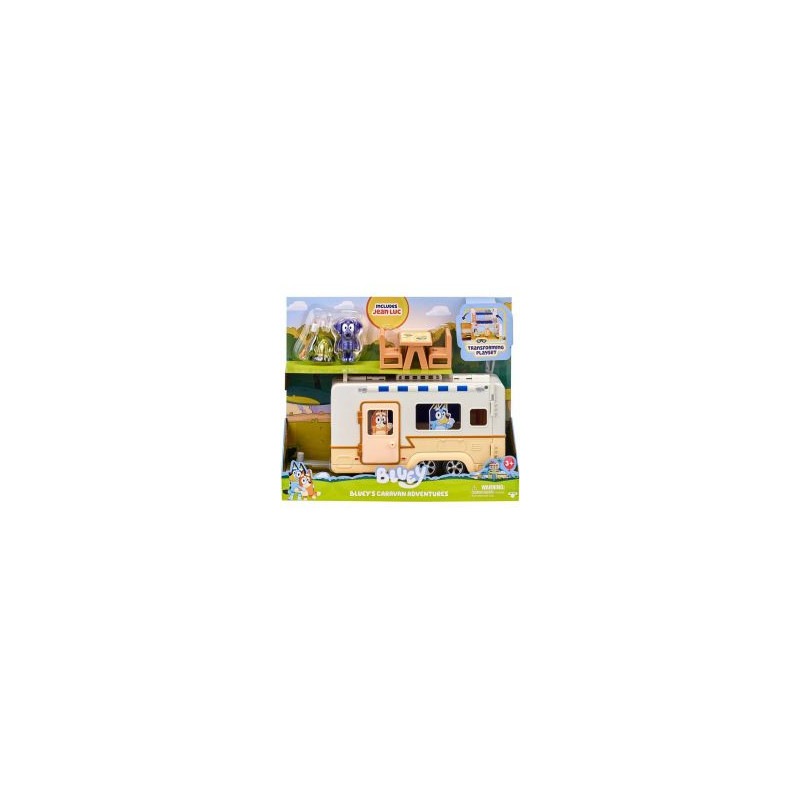 Bluey to 6-letni australijski pies pasterski, który uwielbia się bawić. Jej rodzice i nauczyciele dają jej dużo czasu do ćwiczenia, więc stała się bardzo dobra w wymyślaniu gier oraz w pomaganiu innym w wybieraniu swoich ról i ustalaniu zasad. Jej ulubionymi grami są te, w których bierze udział wiele dzieci oraz dorosłych (w szczególności jej Tata), a najbardziej lubi udawać, że sama jest już dorosła i robić rzeczy zarezerwowane dla dorosłych. Uwielbia zamieniać każdy dzień swojej rodziny w niekończącą się i radosną przygodę. Wybierz się na wycieczkę przyczepą kempingową z rodziną i przyjaciółmi Bluey. Zestaw Bluey - Przyczepa kempingowa oferuje mnóstwo atrakcji, którymi można zająć się podczas wakacji w przyczepie kempingowej. W tym rozkładanym zestawie jest miejsce dla całej rodziny. Złóż dach, aby odsłonić drugie piętro i przytulne łóżka piętrowe. Odwróć tył przyczepy, aby odsłonić kuchnię. Co piecze się w piekarniku? Otwórz i zobacz. Posadź figurki na krzesłach wokół stołu i przygotuj się na obiad lub piecz pianki nad ogniskiem. Ozdób przyczepę kempingową za pomocą arkusza naklejek dołączonego do zestawu. Zestaw Bluey - Przyczepa kempingowa zawiera 7 elementów do zabawy i jest kompatybilny z rodzinnym autem Healer 4WD (sprzedawane oddzielnie). Podłącz do niego przyczepę kempingową i ciągnij za sobą po autostradzie, jadąc na wycieczkę. Zestaw zawiera jedną figurkę Jeana Luca o wysokości 6,3 cm z ruchomymi rękami i ciałem. Zawartość: - 1x przyczepa kempingowa, - 1x figurka Jean Luc, - 1x ognisko, - 1x pianki na patyku, - 1x stół, - 2x krzesło, - 1x arkusz naklejek. Dzieci z radością będą odtwarzać sceny z serialu dzięki tym uroczym zabawkom.