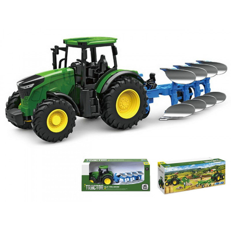 Traktor z maszyną rolniczą. Został wyposażony w grube, gumowe koła z charakterystycznym bieżnikiem. W środku kabiny zobaczymy kierownicę i siedzenia. Odwzorowano również pionową rurę wydechową. Maszyna rolnicza jest odczepiana. Posiada ruchome elementy. Jest to świetny prezent dla każdego dziecka, które jest zainteresowane pojazdami rolniczymi.