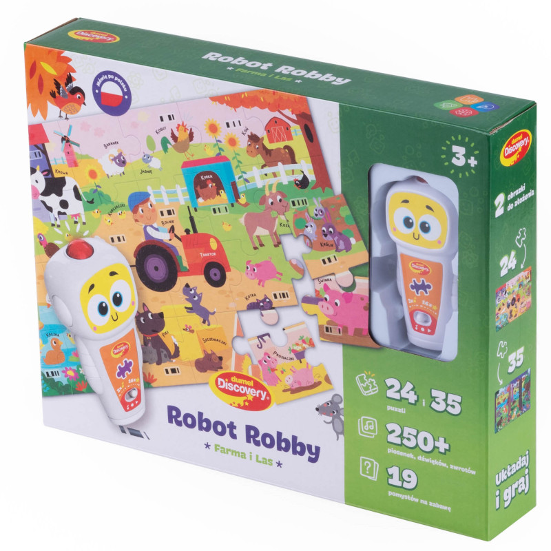 Robot Robby zaprasza na zabawę w układanie i odkrywanie! Pierwszy etap zabawy polega na ułożeniu dwóch obrazków ze znajdujących się w zestawie puzzli. Gdy już maluch upora się z tym zadaniem, do gry wkroczy wesoły robocik, który przygotował dla najmłodszych ponad 350 dźwięków i aż 16 różnych gier, a wśród nich szukanie zwierzątek na obrazku, dopasowywanie ich odgłosów, odtwarzanie sekwencji i rozpoznawanie domków zwierzaków. Dźwięki pochowane są w 32. aktywnych polach, oznaczonych kodem kreskowym. Aby robot prawidłowo odczytał pole, należy delikatnie przycisnąć końcówkę robota do kodu kreskowego, umieszczając robota pionowo nad polem.