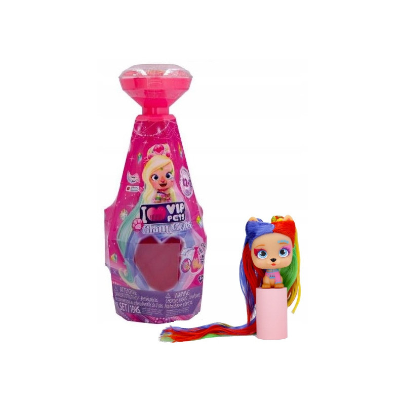 VIP PETS Gems Glam to kolekcja składająca się z ponad 12 nowych, najmodniejszych piesków z bardzo długimi włosami (aż 30 cm!). Każdy zestaw zawiera 9 niespodzianek i 6 różnych akcesoriów do stylizacji włosów, które błyszczą się bardziej niż kiedykolwiek, jak w nowych odcinkach serialu internetowego na YouTube! W skład każdego zestawu wchodzi nowy fotel fryzjerski, na którym można wystylizować swojego VIP PET i poczuć się jak prawdziwy stylista fryzur, tak jak Fabio i Fabia. Laleczki znajdują się w opakowaniu z klejnotem!