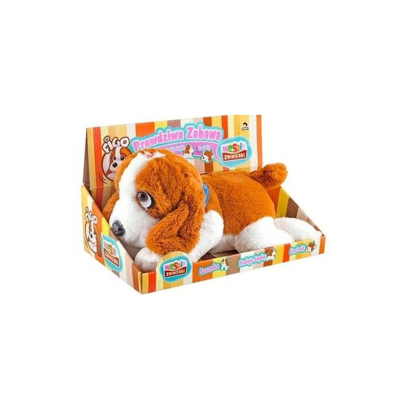 Maskotka Madej Piesek Figo to pluszowa zabawka o wysokości 22 cm, która wyróżnia się miękkim i przyjemnym w dotyku materiałem. Piesek jest w biało-rudych kolorach i ma interaktywną funkcję muzyczną, działającą na 3 baterie AA, co umożliwia odtwarzanie dźwięków i melodii.