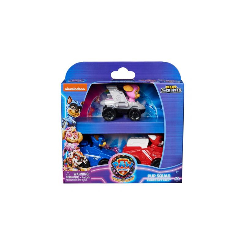 POJAZDY Z FILMU PSI PATROL Każda wyścigówka Pup Squad zawiera oryginalne elementy z serii Psi Patrol Dzięki stylistyce i wzornictwu z filmu The Mighty Movie samochodziki wyglądają tak samo, jak pojazdy ratunkowe Mighty Pup z filmu
