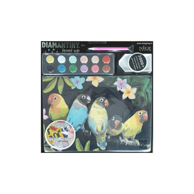 Zestaw z kryształkami do tworzenia mozaik z kolorowymi kamieniami. Zabawa z mozaiką diamentową polega na układaniu obrazka z tysięcy malutkich, kolorowych diamencików według naniesionego na kartonie nadruku. Obrazek pokryty jest warstwą klejącą, która utrzymuje kryształki na odpowiednich miejscach. Kompletny zestaw zawiera: obrazek na grubej tekturze, na który naniesione są literki i cyfry wskazujące miejsca, gdzie należy ułożyć poszczególne kolory, diamenciki w różnych kolorach, aplikator z woskiem pojemnik na diamenciki oraz przewodnik po kolorach