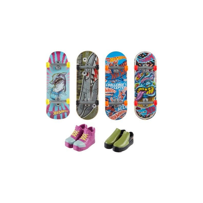 Ćwicz epickie sztuczki i trudne triki z tym wielopakiem Hot Wheels Skate z deskorolkami i butami na palce. Hot Wheels(R) i legenda skateboardingu, Tony Hawk, połączyli siły, aby stworzyć epickie deskorolki do jazdy palcami, które wyglądają niesamowicie podczas robienia trików! W tym zestawie są cztery różne deskorolki do jazdy palcami o różnorodnym wyglądzie oraz 2 różne pary butów deskorolkowych na palce, które pasują do wszystkich desek. Dzięki butom dzieci mogą wyczuć deskę palcami i ćwiczyć popisowe sztuczki. W każdym zestawie jest jedna wyjątkowa deska i para butów deskorolkowych, których nie znajdziesz nigdzie indziej. Kolory i elementy dekoracyjne mogą się różnić.