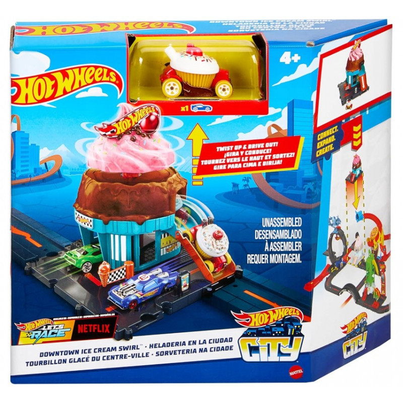 Przekręć „truskawkowy krem”, aby wjechać zabawnym autkiem na samą górę. Gdy pojazd znajdzie się na szczycie, automatycznie wyjedzie na zewnątrz i popędzi ku kolejnym przygodom! Lodziarnia ma kilka punktów łączenia, aby można było ją łatwo dopasować do innych zestawów Hot Wheels.