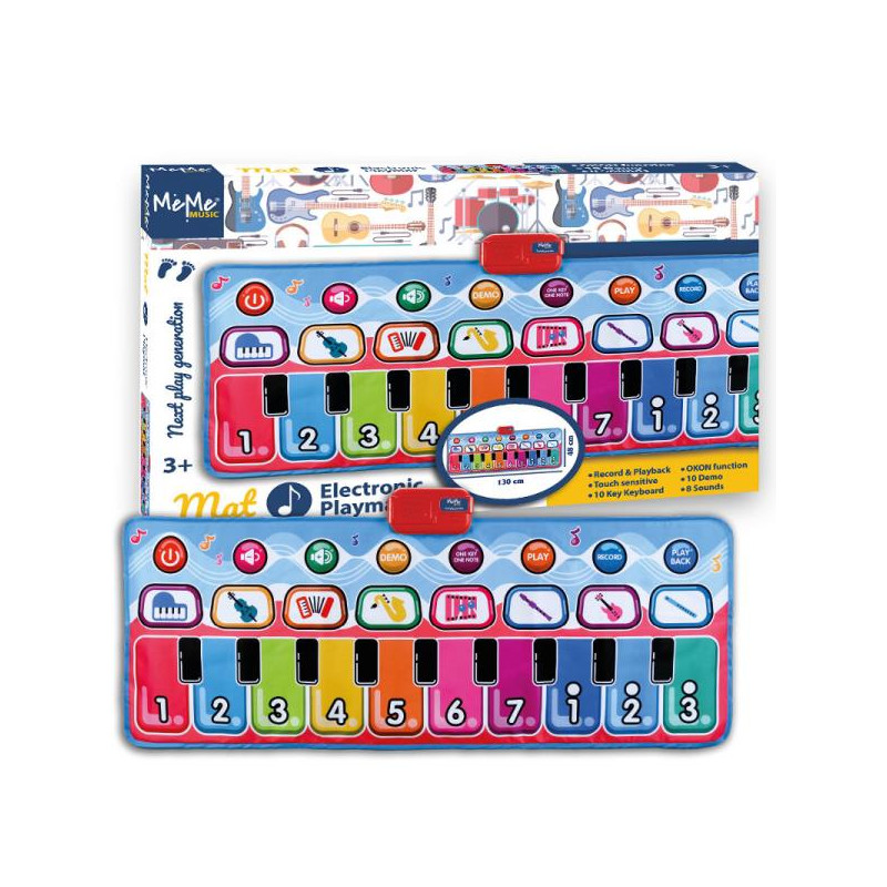 Elektroniczna mata muzyczna, która posiada 10 klawiszy. Zabawka zawiera 8 dźwięków oraz 10 piosenek demo. Możliwość regulacji głośności dźwięku. Możliwość nagrywania i odtwarzania. Powierzchnia zdatna do mycia wilgotną szmatką. Baterie nie są częścią zestawu.