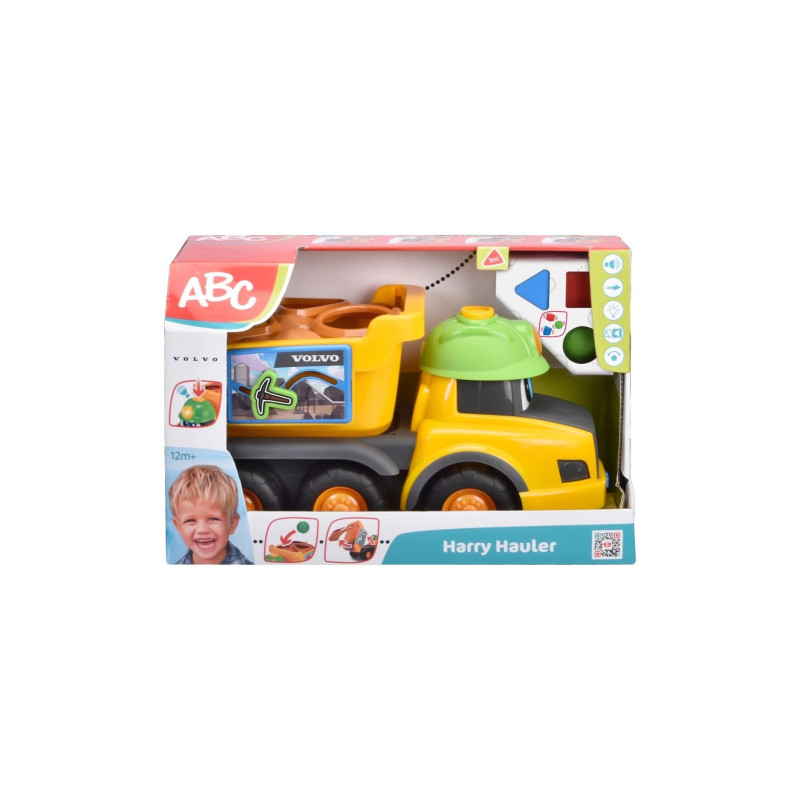 Pojazd budowlany z sorterem kształtów, 3 klockami, funkcja światła i dźwięku, elementy do przesuwania, dwa różne boki, podnoszona i opuszczana wywrotka. Długość: 30 cm