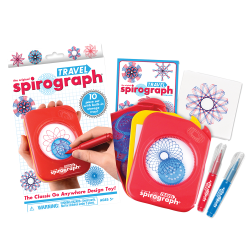 Zestaw zawiera: podróżny Spirograph z pierścieniem, powierzchnią do tworzenia i tacką, 6 kół, 2 pisaki, 24 arkusze samoprzylepnych karteczek, 1 instrukcję z przewodnikiem