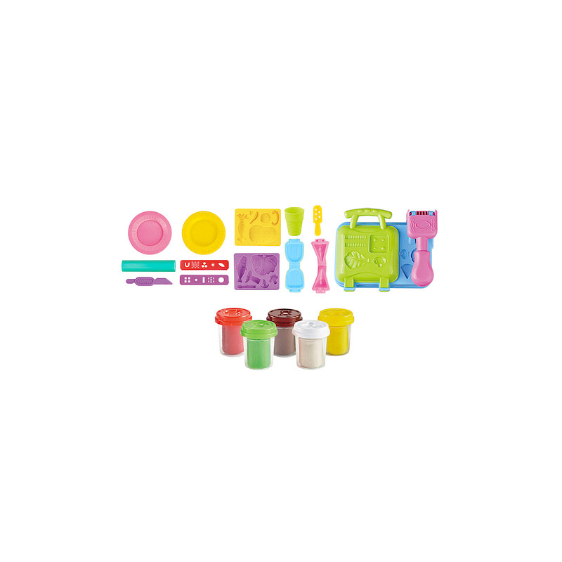Kolorowa ciastolina w słoiczkach , 5 kolorów,oraz plastikowe akcesoria do złożenia maszyny do produkcji pysznych lodów.