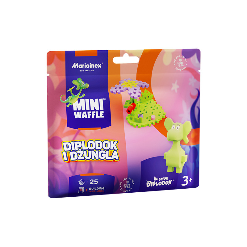 Zestaw Diplodok i Dżungla z serii Mini Waffle to 25 elementów, z których stworzysz fragment z drzewem i kwiatami, oraz figurką przezabawnego smoka Diplodoka. To urocze stworzenie bez przerwy chce przeżywać przygody i odkrywać nowe kawałki świata.