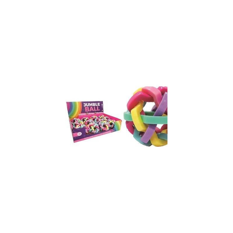 12 szt/disp, śr. piłki 7 cm, piłka składa się z plątaniny gumowych pasków, można ją odbijać, gnieść, rzucać, wym. disp. 29,5 x 21,5 x 7,5 cm