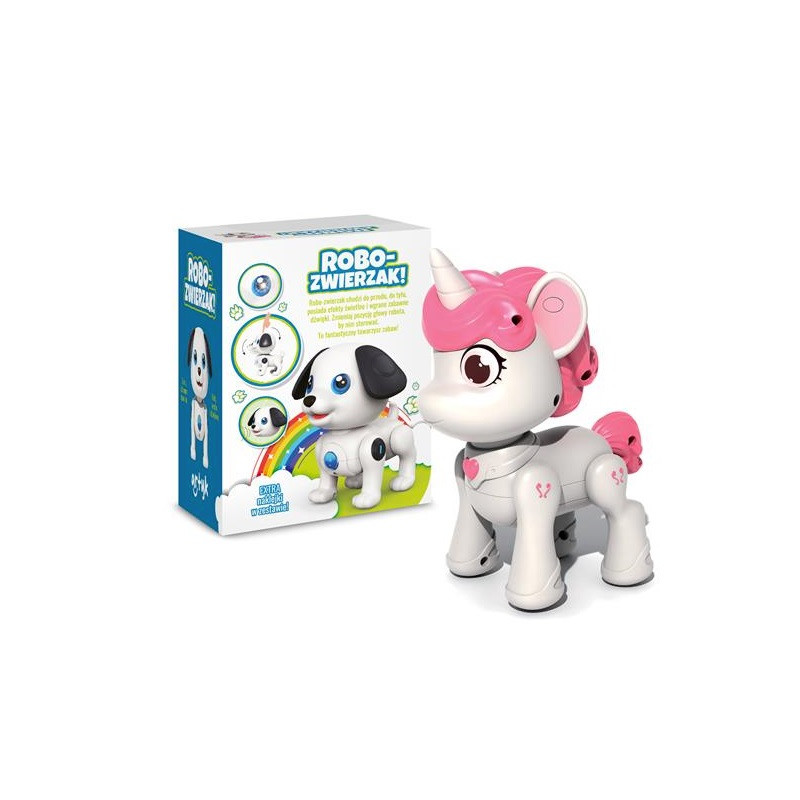 wys. 16 cm, funkcje: porusza się do przodu i do tyłu, po naciśnięciu na głowę zatrzymuje się, posiada efekty świetlne, wydaje zabawne odgłosy., wym. opak. 14 cm x 9 cm x 16 cm., baterie: 2 x aaa, niedołączone