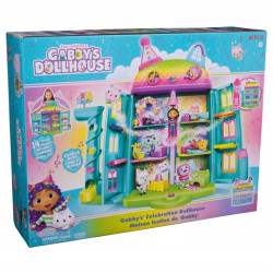 W domku dla lalek znajduje się mnóstwo uroczych mebli i artykułów imprezowych, takich jak toaleta dla kota, stanowisko pianina/DJ-a i łuk balonowy.Po złożeniu tęczowego dachu odsłania się ukryte poddasze. Możesz zamówić dostawę dwóch pudełek-niespodzianek, jak w serii, za pomocą wieży dostawczej Cat. Otwórz je i znajdź zabawkowy tort oraz trofeum! Zeskanuj kod QR w jednym z pól i odblokuj nagrodę w bezpłatnej aplikacji Gabby's Dollhouse.