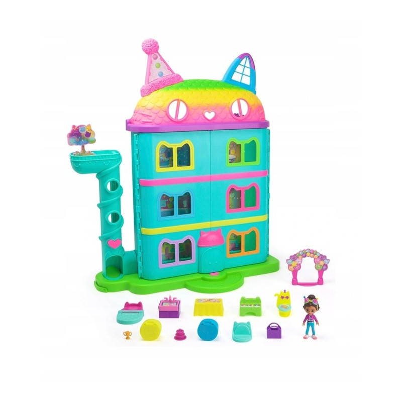 Domek dla lalek Purrfect Party o wysokości ponad 60 cm oferuje sześć różnych pokoi na trzech piętrach. Dzięki kolorowemu tęczowemu dachowi i figurce Gabby o wysokości 8,8 cm każda gra staje się przeżyciem. Skorzystaj z windy Cat-A-Vator, aby odwiedzić wszystkie piętra i odkryć ukryte poddasze, składając dach.