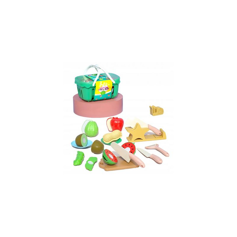 6 warzyw do krojenia, 2 talerzyki, nóż, deska, koszyk z uchwytem.