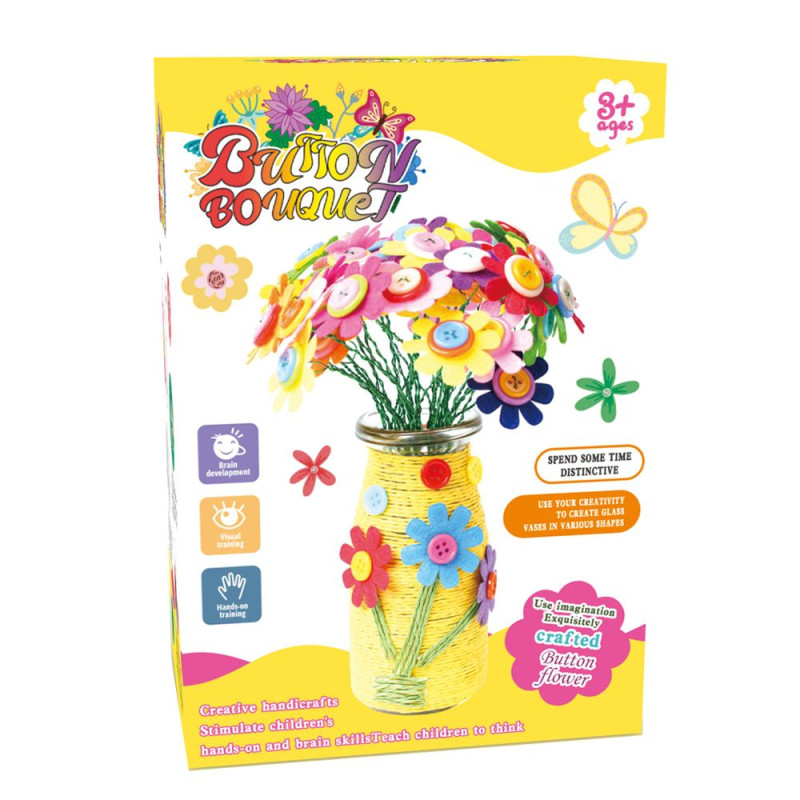 Dzięki kolorowym guziczkom, filcowym kwiatuszkom i drucikom dziecko może zaprojektować swój własny, niepowtarzalny bukiet. Gotowe kwiaty umieszcza w dołączonym wazoniku, który samodzielnie przyozdabia, tworząc piękną dekorację pokoju lub prezent dla bliskiej osoby.